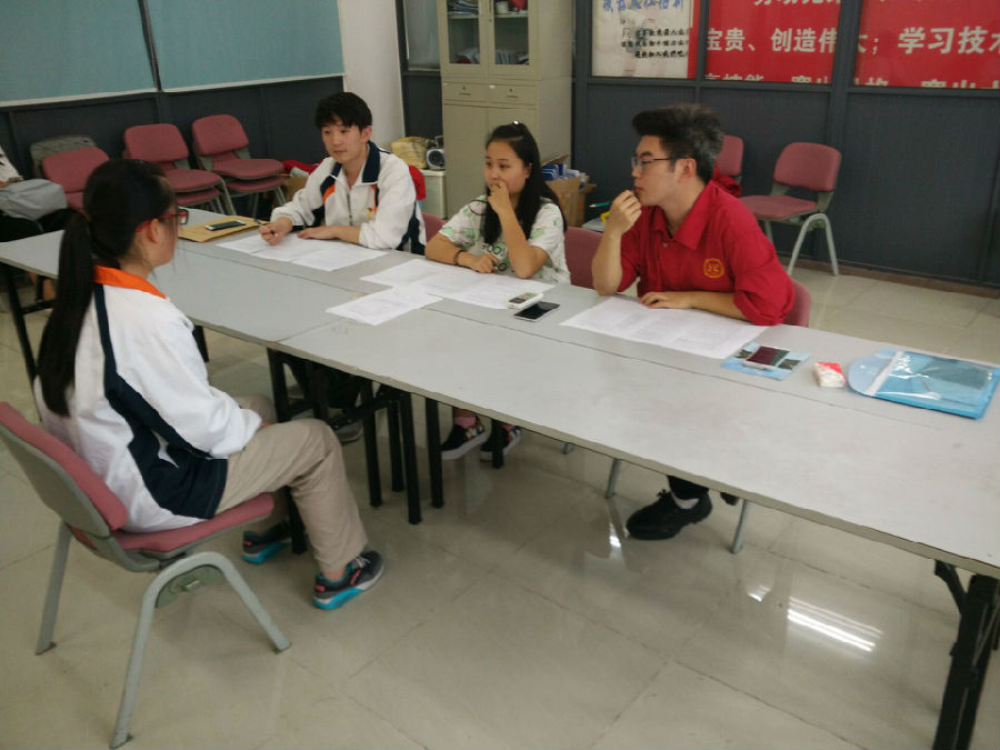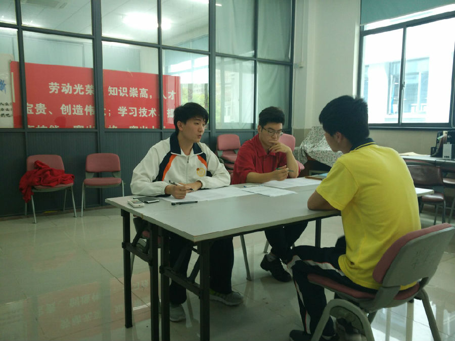 在大厅内,前来面试的同学每个人都做了充足的面试准备。在学生会面试教室内,由学生会主席团许福长卿、温家伟、王优涵三位主席作为面试官,仔细阅读每一个前来面试的同学的竞选信息后,在同学们详细的开场自我介绍后,主席团对前来面试的同学们提出了要求,并由职位的工作特性提出了一些相关工作问题,在仔细聆听了同学们的回答后,主席团经过了讨论,对前来面试的同学进行细致的考量和评测。