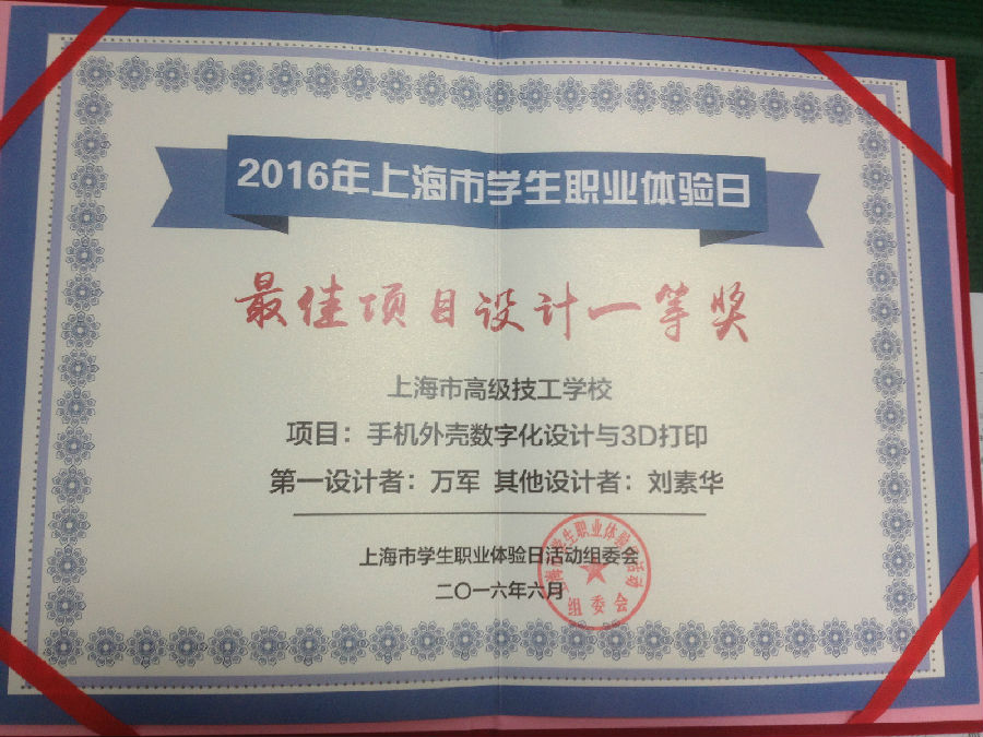 9月13日下午,上海市中等职业学校校长会议在上海市高级技工学校综合大楼11楼思进厅举行,会上表彰了2016年上海市中职学生职业体验日特色组织奖和最佳项目设计奖,其中上海市高级技工学校的“手机外壳数字化设计与3D打印”荣获2016年上海市中职学生职业体验日最佳项目设计一等奖。