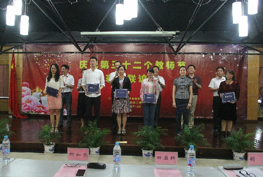 高职学院副院长、高级技校副校长胡宁宣读《关于表彰2015~2016年度学院校优秀教师和优秀教育工作者等先进个人的决定》;学院、校领导为优秀教师、优秀教育工作者、优秀辅导员、优秀班主任、全国职业技能竞赛优秀团队颁发获奖证书。教师代表基础教学部陈燕、制造工程系张利华发表了获奖感言。本次教师节还请到了来自辖区江湾街道社区文化中心表演队为教师节奉献了风格迥异的手拍鼓舞《欢庆的日子》和精彩的越剧表演唱《梁山伯与祝英台回十八》。每年教师节活动的保留节目、新进教师们在会上自我介绍,男、女教师分别演唱了歌曲《水手》、《小幸运》,在制造工程系刘素华副教授的领誓下对着国旗进行庄严的就职宣誓。全国“知音杯”演讲比赛三等奖获得者张建辉同学饱含深情的配乐诗朗诵《老师你最美》,让在座的老师们感受到这份温暖与骄傲。