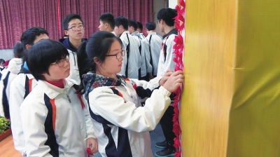 汇聚了红丝带的爱心墙表达了学生们携手抗艾的意愿。 王继明摄