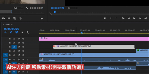 四、移动剪辑:Alt+方向键:通常我们都需要鼠标移动剪辑,但是当你按下D选中对应素材以后,其实你可以按住Alt和上下左右键移动素材的位置。需要注意的是需要激活相应的轨道才能够进行移动。如果你想要快速移动素材,那可以按住Alt+Shift+方向键来快速移动素材。