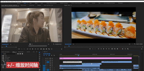 三、时间轴的缩小与放大:\反斜杠,通常我们使用+/-号缩放时间轴,但是你也可以使用反斜杠来进行快速缩放,只需按一下你就可以缩放到整个序列的长度。然后再按一下就可以回到原来的状态。相对效率会比加减号高很多。