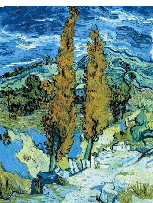 梵高疯了,进入精神病院后画出来的画也出现了翻天覆地的变化:整个画面都在旋转、扭曲,似乎能看到他此时的精神世界也在一样崩溃瓦解、直至坍塌。前文的《星夜》就是梵高发疯后所作的作品。