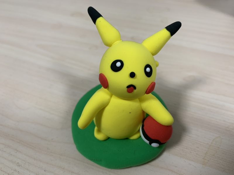 皮卡丘最重要的部分就是,它脸颊上能放出“十万伏特”的腮红了,我们用红色的超轻黏土来做它的腮红。这样一个栩栩如生的皮卡丘就出来了。