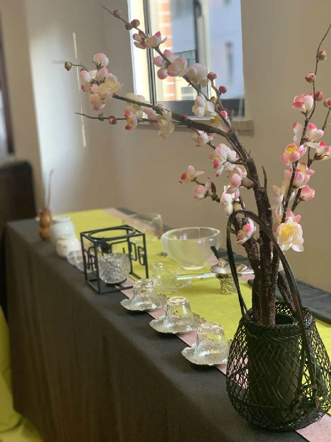以“冬”为主题,设计调饮茶及朗诵与“梅花”有关的诗句,“阅遍人间笑浮华,莫若细品一杯茶。”古朴的茶桌,精美的茶具,悦耳的音乐,还有身穿汉服举止优雅的同学。