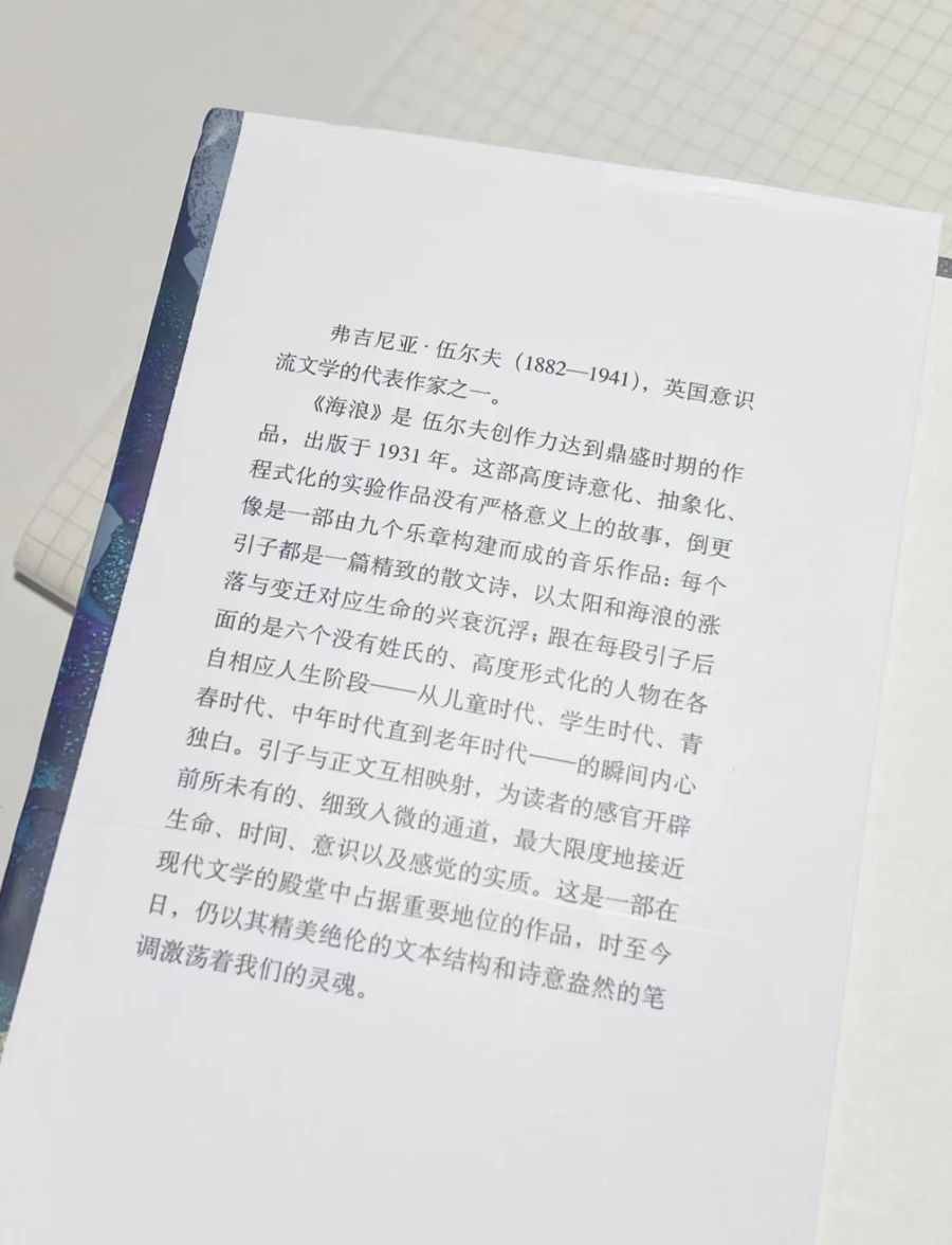 书的作者伍尔夫是披着小说家外衣的诗人。辞藻极其繁复华丽之能事儿,感觉是在嗑药或者精神极其不稳定的时刻写出来的感觉。伍尔夫是英国意识流文学的代表作家之一,这本《浪》被公认为是伍尔夫鼎盛时期的代表作品。
