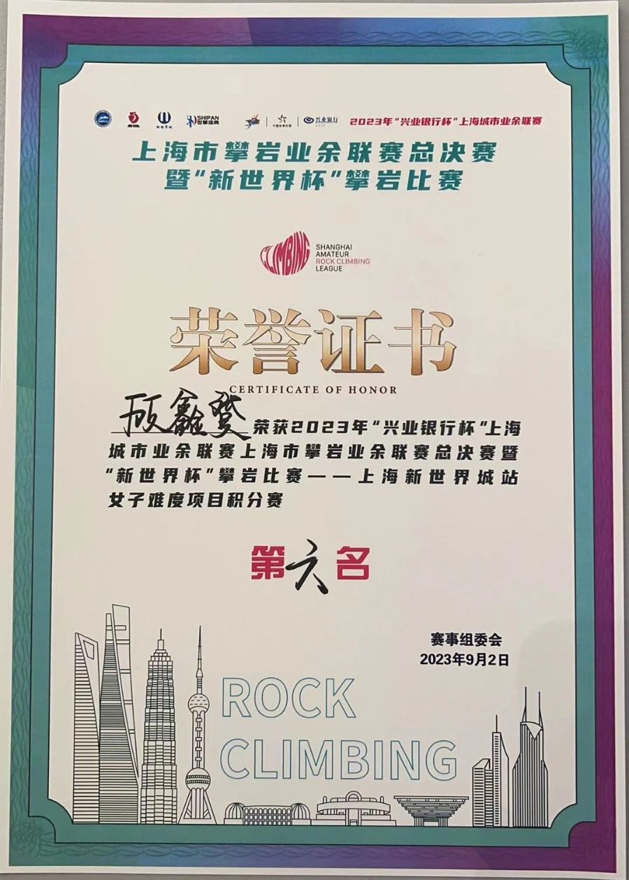 最终,在各位运动健儿的永不放弃的努力下,21文物2班的顾鑫贇同学荣获2023年“兴业银行杯”上海城市业余联赛上海市攀岩业余联赛总决赛暨“新世界杯”攀岩比赛--上海新世界城站女子难度项目积分赛第6名。 我校学生在体育模块中认识了岩壁上的芭蕾——攀岩运动这个项目。通过学、练,每学年都有十多位学生向世界吉尼斯纪录51.28米最高室内岩壁发起挑战,并成功登顶荣获证书!