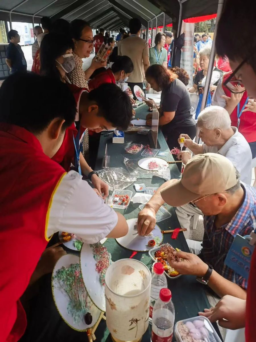 活动刚刚开始,就有不少过路的爷爷奶奶被展示的团扇吸引住了,纷纷表示想体验团扇制作,不一会儿摊位前就围满了人。22酒店的同学们热情招呼着,向爷爷奶奶介绍花艺是我们酒店管理专业的招牌专业课,我们在学校老师的指导下对花艺有了更为深入的理解。