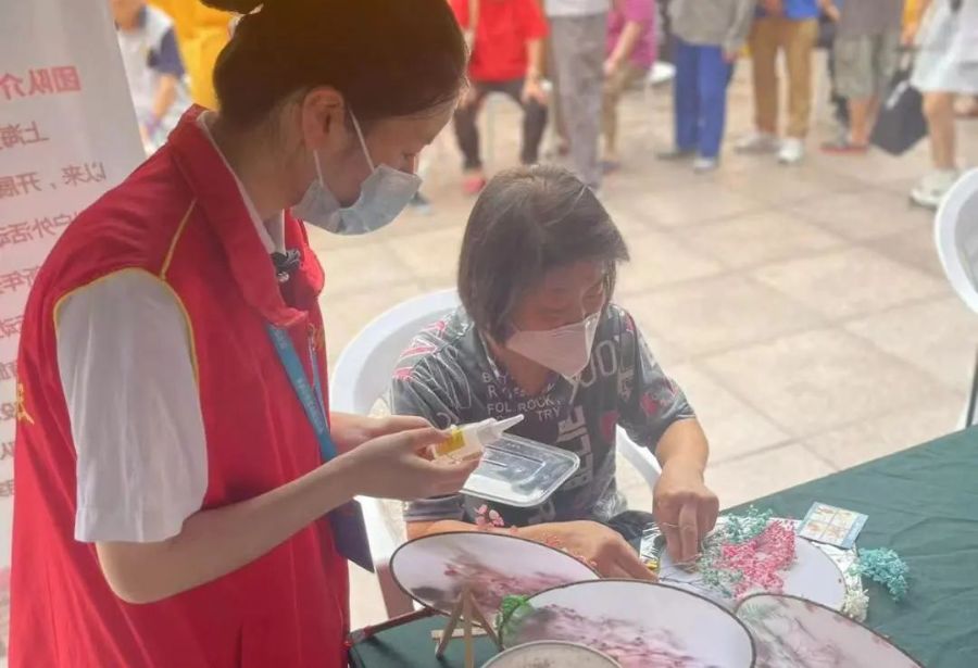 爷爷奶奶们在同学的指导下一步一步完成团扇的制作,不少年纪大的老人视力不好,看不清胶水,在他们大致摆好自己喜欢的样式后,同学会热情帮助他们把干花固定在扇子上。还有一些听觉有障碍的老人,同学在交流时没有不耐烦,而是一遍一遍大声重复着所说的话。在每一个团扇制作完成后,同学会帮忙给团扇套上塑料膜供老人带回家。在同学们认真细致的服务下,赢得了老人们的一致肯定,大家虽然很热很累,但心里却很充实,感到意犹未尽。