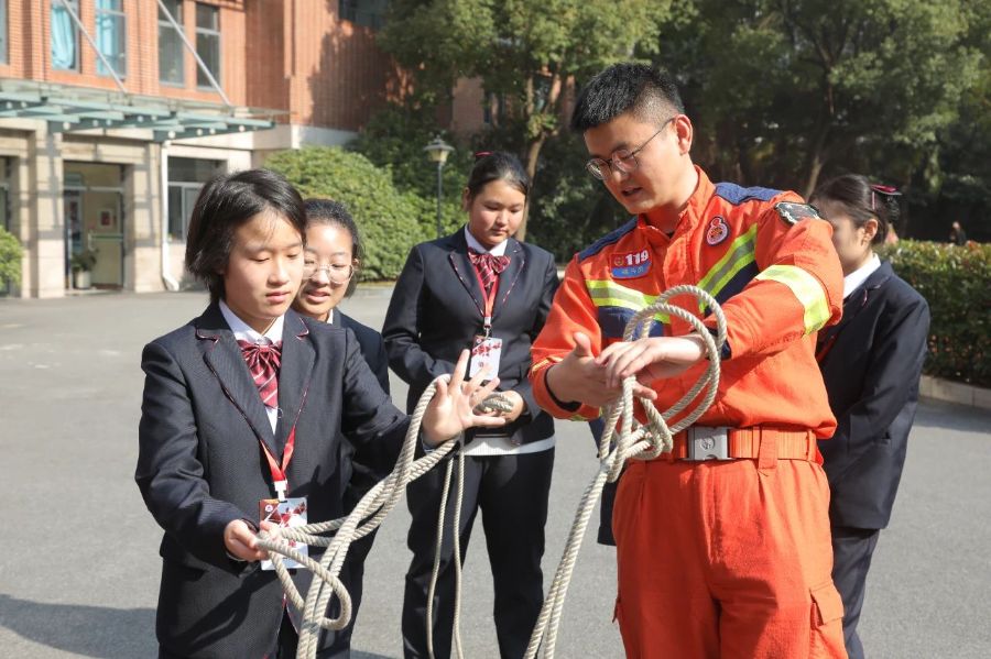 此次紧急疏散安全演练特邀上海市消防总队黄浦支队北京中队和潍坊消防救援站的消防员们进校园。演练前,消防员首先向大家介绍了火灾的危害性、家庭和单位的火灾隐患排查方法、常见火灾逃生方式和灭火器材操作等方面的知识。演练后,同学们还向消防员学习了灭火器、安全绳的使用,在实践操作中加深了对消防器材的了解,提高了自我防护的安全意识。