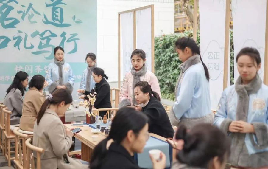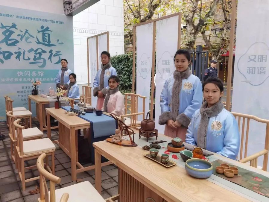 12月11日,我校“博雅茶韵”茶艺社团成员和“丝桐雅韵”古琴社团成员在颜晓红和邵潇雨两位老师的带领下来到了历史悠久的又新印刷厂旧址,在旧址外小广场中参加了“品茗论道 知理笃行”市民修身行动特色项目的活动,本次活动由黄浦区文明办、黄浦区教育局支持指导,上海市商贸旅游学校承办,本次活动引入了“快闪茶馆”的概念元素。