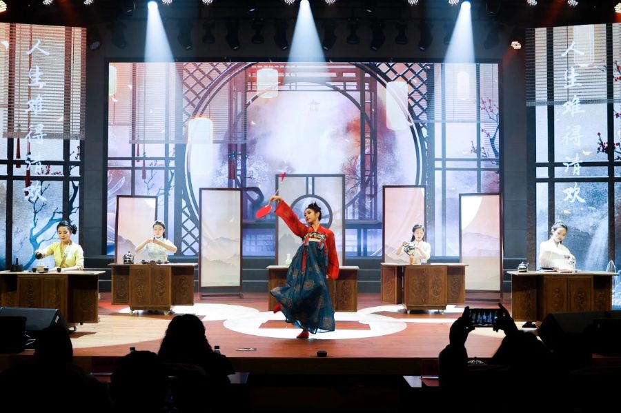 情景剧《寻茶问史》中,五位“茶艺师”带来五种不同的茶,通过舞蹈、茶道等方式来展现茶文化的博大精深,也体现了学校长达十年“以茶育人”的办学特色。