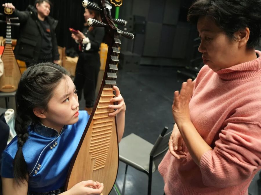 活动当天气温骤降,寒气逼人,大家为将快闪活动完美地呈现在大家面前,不畏严寒,早早来到了演艺中心做准备。乌圆晓老师帮助成员们梳理着妆发,成员家长也一同前来帮忙打理,共同支持着这场演出的进行。周红老师十分耐心的带着成员们开嗓、调琴、熟悉曲目。