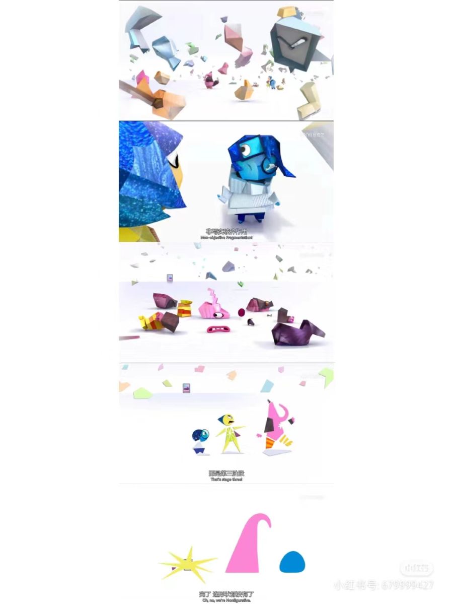 第三个场景:忧忧一直是个不讨喜的家伙,她触碰了什么记忆,那段记忆就变得特别悲伤,所以乐乐不让她碰任何记忆球,甚至忧忧自己也自暴自弃了不习惯自己,赖在地上,看不到希望似的一动不动,乐乐一开始为了让茉莉快乐自己尝试独自回到中心,不带忧忧了。但是最终她发现了忧忧的价值,只有接受了忧忧,让她来操作控制台,把情绪释放出来,和爸爸妈妈们坦然自己的真实想法,得到爸爸妈妈的理解。我们只有真正拥抱了这些消极的情绪,才能不失控,更好的平衡身心。