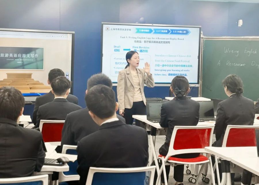 11月5日下午,我校旅游外语专业组举行了旅游英语应用文写作课程的区级公开教学研讨活动,赵慧老师展示了主题为“餐厅展示牌英文文案撰写”的公开课。来自西藏日喀则第二中等职业学校和云南省澜沧职业高级中学的三位老师,以及黄浦区职业教育兼职教研员奚小英、中华职业学校英语老师和本校英语及其他学科教师共同观摩了这堂课。