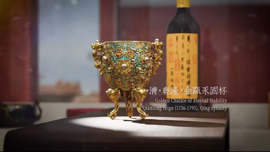 金瓯永固杯是清朝乾隆年间制造的金制酒杯,高12.5厘米,口径8厘米,足高5厘米。其杯口铸有金瓯永固,寓意江山永固,杯身錾刻宝相花,花蕊以珍珠及红,蓝宝石为主,两侧各有一变形龙耳,龙头上有珠,三足为象首式,额顶及双目间亦嵌珠宝。