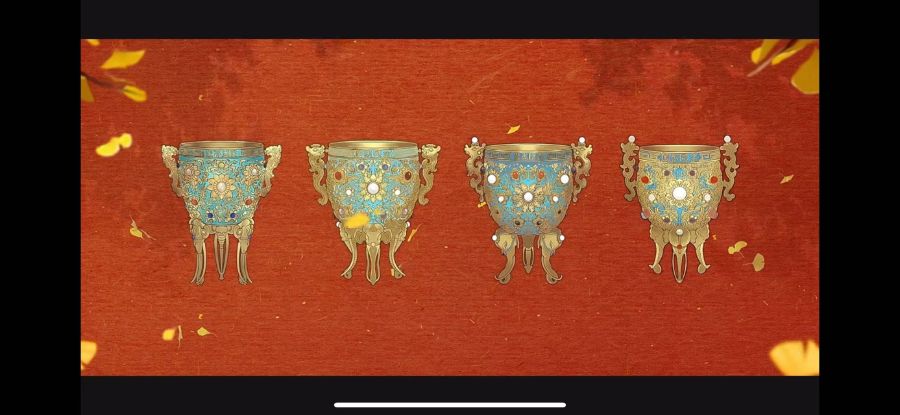 杯金质,鼎式,圆形,直口。口沿錾回纹一周,一面錾金瓯永固,一面錾乾隆年制。金杯的设计及加工皆属上乘,是清代皇帝每年春节举行开笔仪式时的专用酒杯。金瓯永固字样寄托了清乾隆皇帝希望江山永固的愿望。物华弥新这款游戏中设计了金瓯永固杯的人物形象,可以拉进大家于文物的距离。