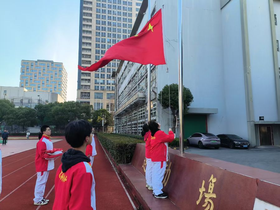 7时30分,升旗仪式在雄壮的进场音乐中拉开序幕。国旗队迈着铿锵的步伐护送国旗入场,全体师生肃立行注目礼,彰显着师生对祖国的热爱与敬意。随着国歌奏响,五星红旗冉冉升起,迎风飘扬,嘹亮的国歌回荡在校园上空。