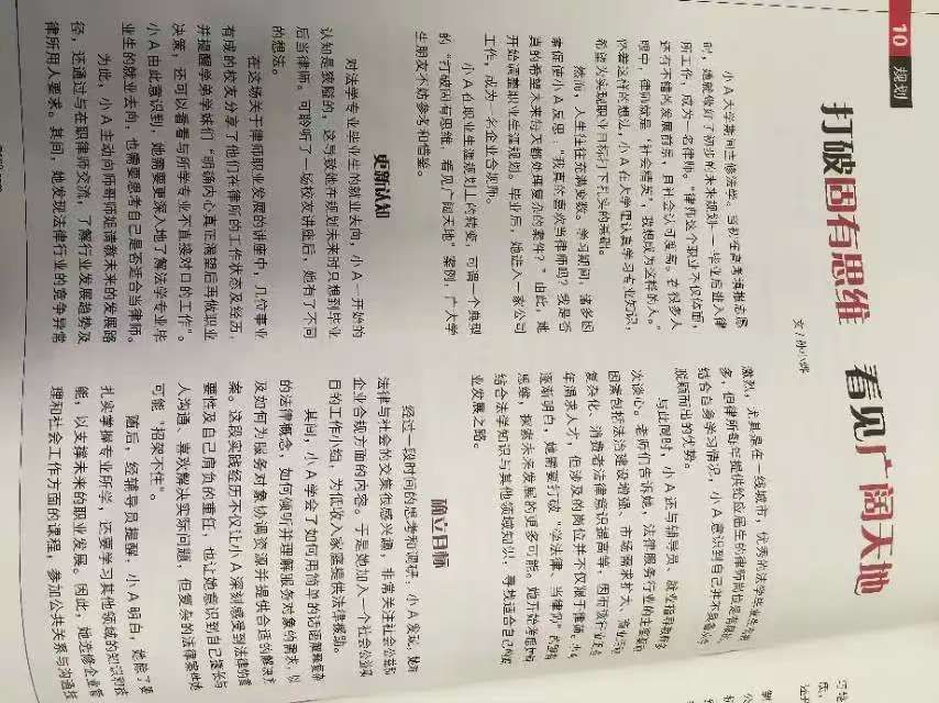 读《打破固有思维 看见广阔天地》感慨颇多。小A的经历如同一盏明灯,照亮职业规划的迷局。起初,她怀揣着对律师职业的常规憧憬,却在学习生活中因变数开始反思。这启示我们,固有思维易束缚职业发展,应敢于打破。在成长路上,不能仅凭初始认知锚定方向,要像小A一样,通过与师长交流、参与实践等方式,拓宽视野。多了解行业动态,探索跨领域结合点,才能发现更契合自身的职业路径,在不断变化的世界中,找到属于自己的广阔天地。