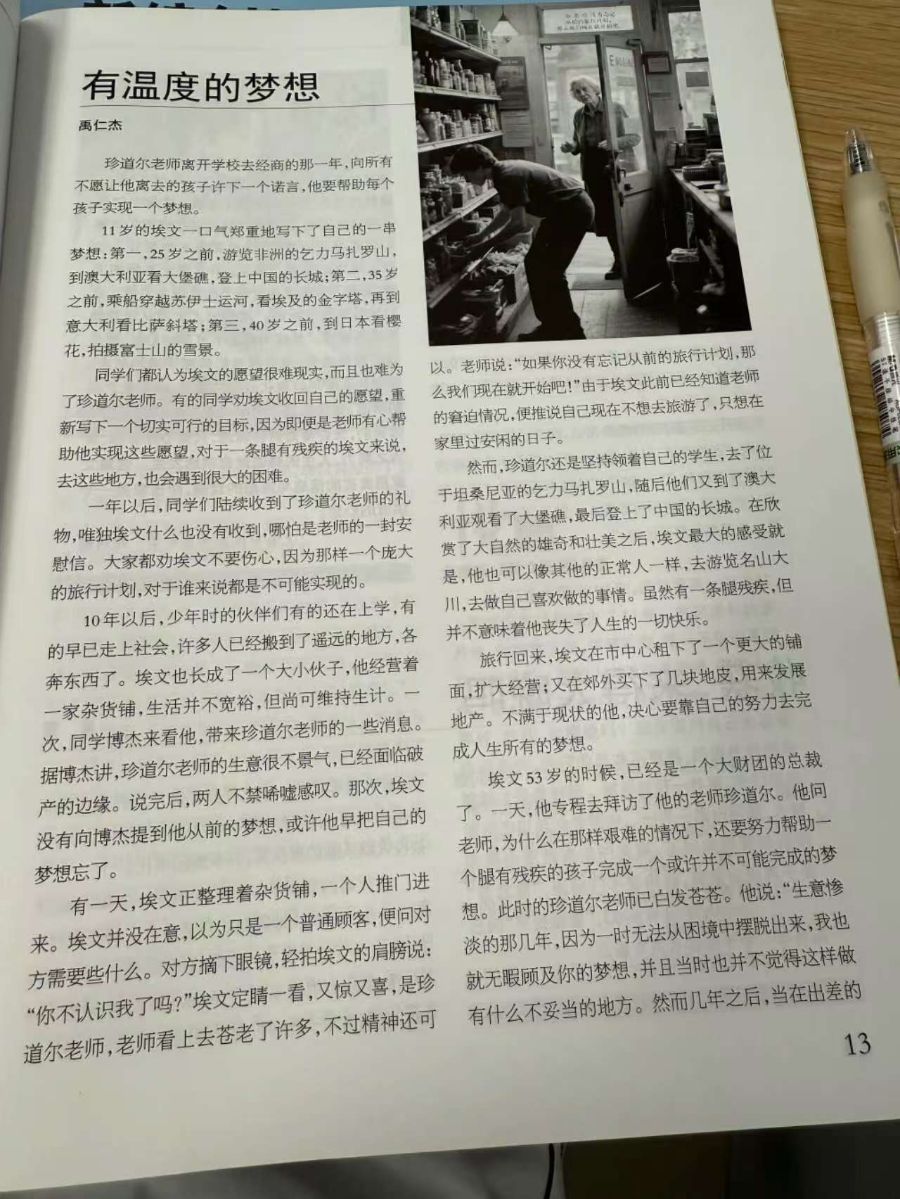 读《有温度的梦想》,深受触动。珍道尔老师一诺千金,即便生意受挫,仍助力残疾学生埃文实现梦想,这份坚守与善良令人动容。埃文虽身有残疾,却未向命运低头,在老师帮助下勇敢追梦,领略世界壮美。梦想本就熠熠生辉,老师的助力如璀璨星光,照亮埃文前行路。它让我们明白,承诺重如泰山,梦想不会因困境折戟,只要坚守与奋进,就能绽放光彩,温暖自己也照亮他人。