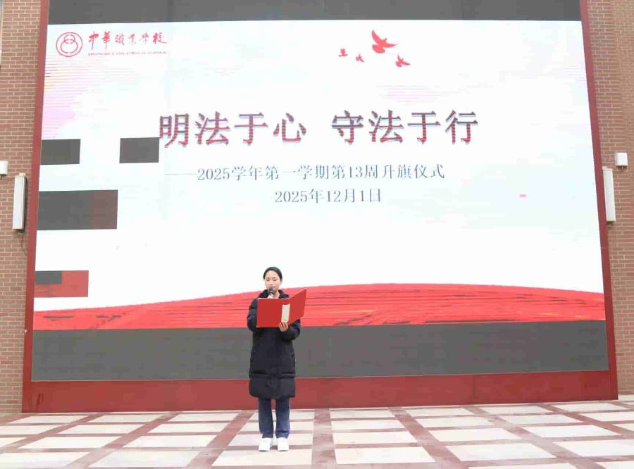 为深入学习宣传贯彻习近平法治思想,迎接我国第十二个国家宪法日及2025年全国“宪法宣传周”,12月1日,我校隆重举行以“明法于心 守法于行”为主题的第13周升旗仪式。本次仪式由徐蔡悦同学主持,全体师生共同参与,在庄严的氛围中感悟宪法力量,厚植法治信仰。