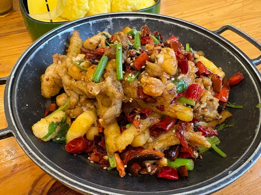 铁锅端上桌时,还滋滋作响,滚烫的热油裹着红亮的辣椒,将香气猛地炸开在空气里。牛蛙腿肉饱满如蒜瓣,每一块都均匀地裹满酱色,在灯笼椒与花椒的山峦间若隐若现。