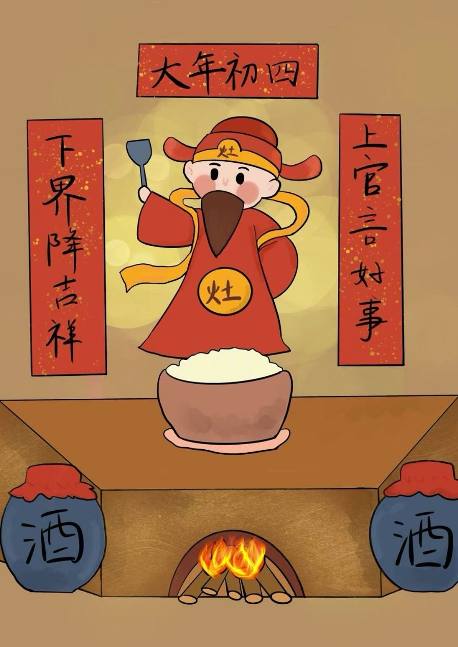 • 正月初四:迎灶神:这一天是恭迎灶神回民间的日子,人们会准备好牲礼果蔬,焚香、烧金纸,以示恭迎。全家人还要在一起吃折罗,即把几天剩下的饭菜合在一起的大杂烩,打扫年货。