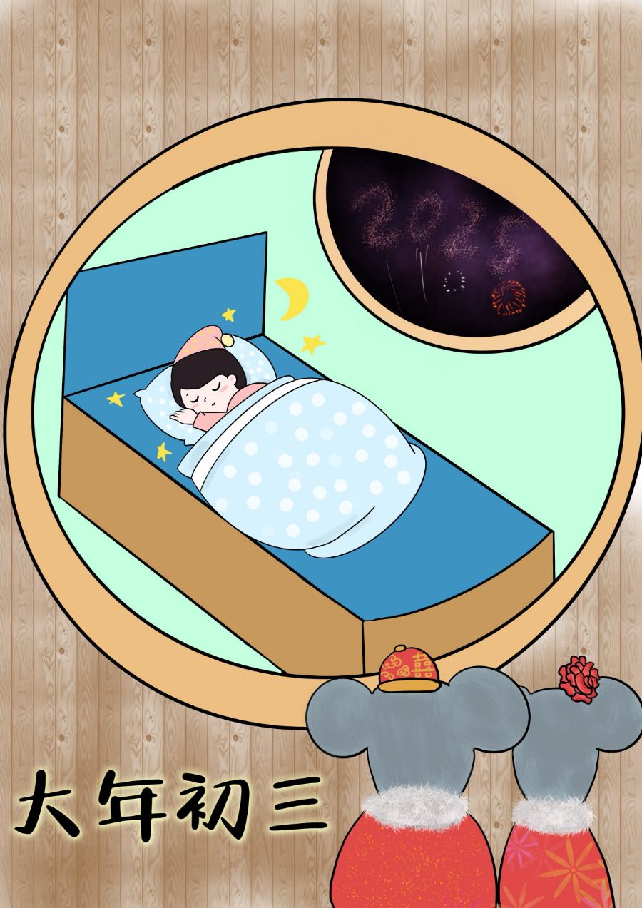 • 正月初三:安睡迟起:初三又称赤狗日,传说这天容易与人发生口角争执,不宜外出或宴客,所以人们通常会早点熄灯睡觉,安睡迟起。