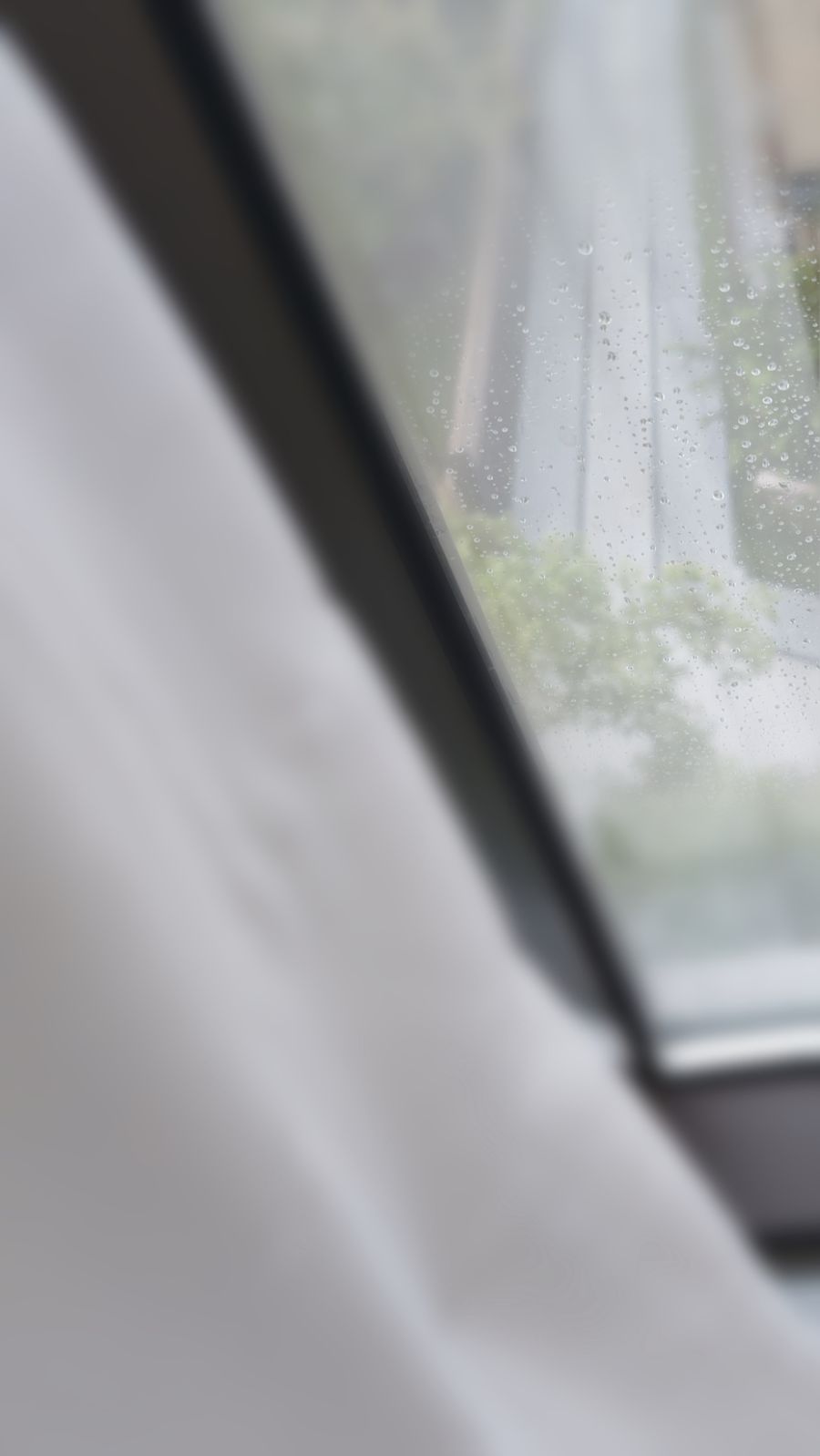 - 背景:窗外的绿意与建筑轮廓被水珠晕染成朦胧的色块,隐约可见鲜嫩的树叶与浅灰色的建筑,暗示着雨后清新的空气与湿润的环境。